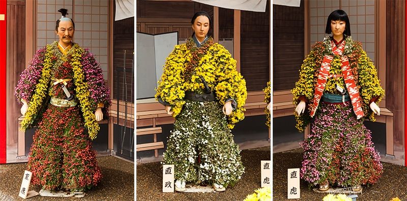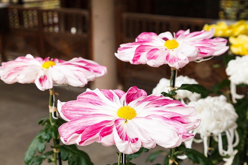 小菊如同開遍了山崖一般,這種造型名稱為「懸崖」;而從一株大菊中開出無數菊花的「千輪咲(Senrinzaki)」造型,也美不勝收,令人眼花繚亂。各種根據不同主題製作盆景藝術作品以及全國菊花節中常見的菊花人偶等,也值得一看。來到會場,你一定會發現「菊花」實在是一種品種豐富、風情萬千的花卉。