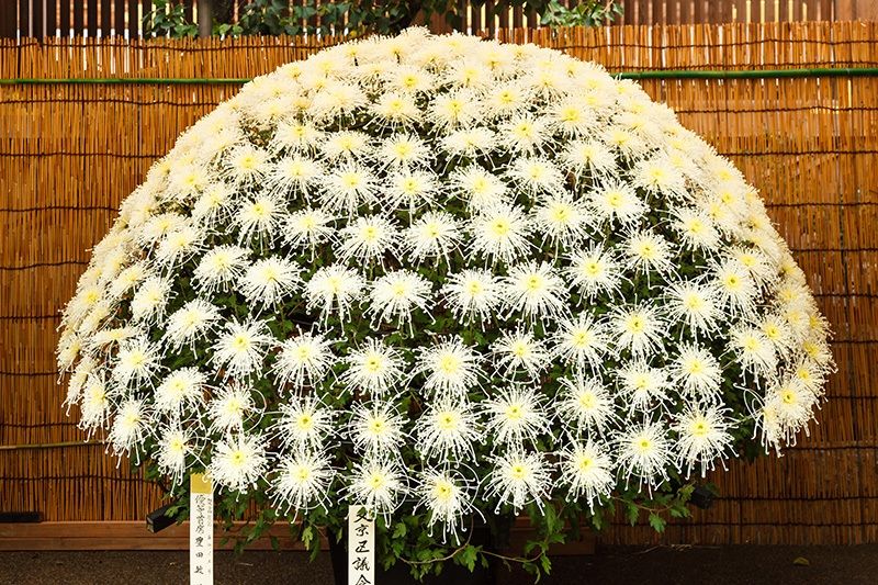小菊如同開遍了山崖一般,這種造型名稱為「懸崖」;而從一株大菊中開出無數菊花的「千輪咲(Senrinzaki)」造型,也美不勝收,令人眼花繚亂。各種根據不同主題製作盆景藝術作品以及全國菊花節中常見的菊花人偶等,也值得一看。來到會場,你一定會發現「菊花」實在是一種品種豐富、風情萬千的花卉。