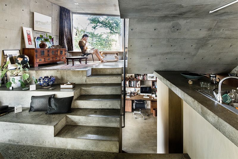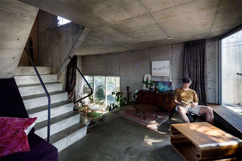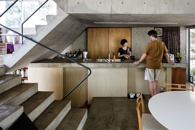 建築師加茂紀和子和Manuel Tardits在東京世田谷區建造了自己的房屋。他們嘗試採用混凝土做原料,使之與周圍的自然達成某種和諧的關係。房屋建在稍微偏離宅地中心的位置,使周圍形成了數個小小庭園。