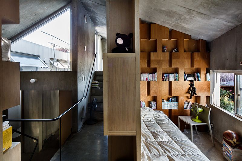 樓中樓式設計使下樓的家庭公共空間和上樓的私人空間自然巧妙地連接在一起。每個寢室僅用書架隔開。兩位建築師對此不覺得有任何問題,但對兩個長大的孩子來說,或許有些感到難以接受。