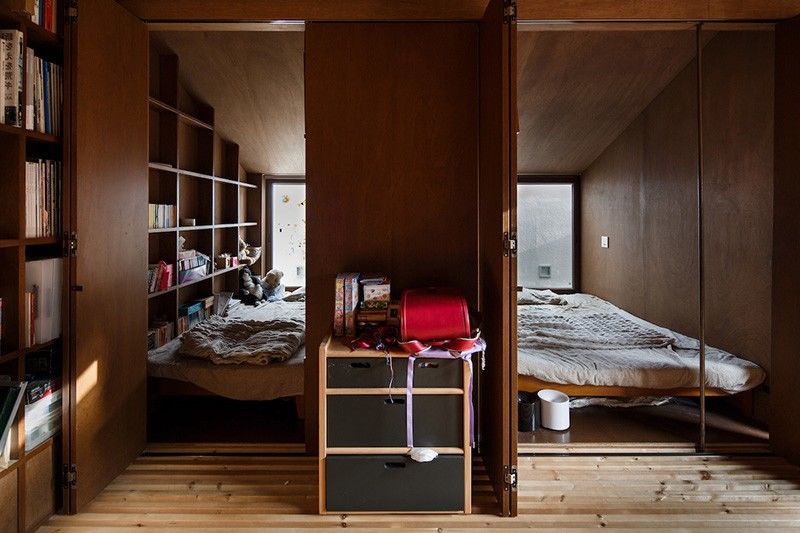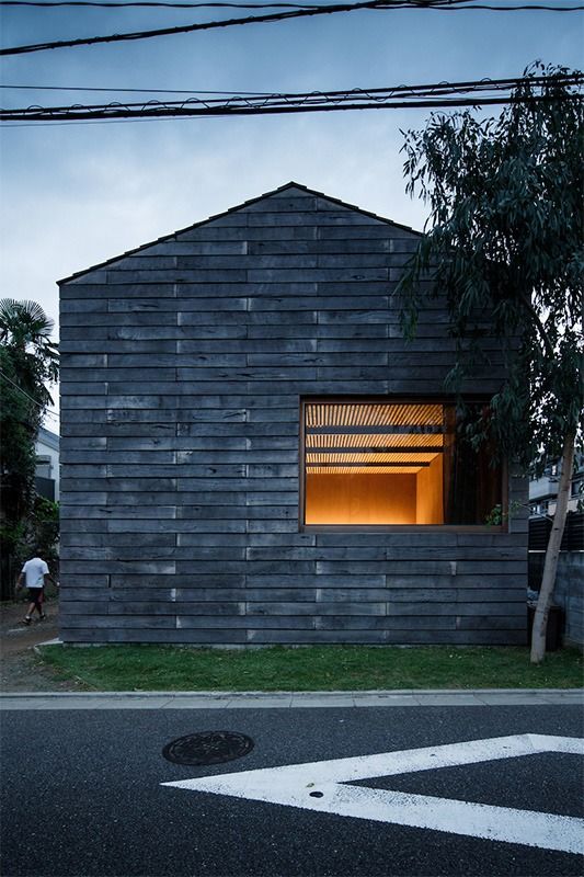 這處位於東京世田谷區駒澤的住宅,從形狀來看,與周圍的房子並無太大區別。建築師的設計宗旨,是對日本戰後房屋建築原型做出重新詮釋。不過它不是體現在外觀上,而是通過牆面材料、上下樓層的關係和窗戶的位置來打出新意。在外牆和屋頂鋪設灰暗色的桉樹木材,讓人感覺到一種日本古民宅的氣氛。