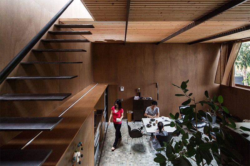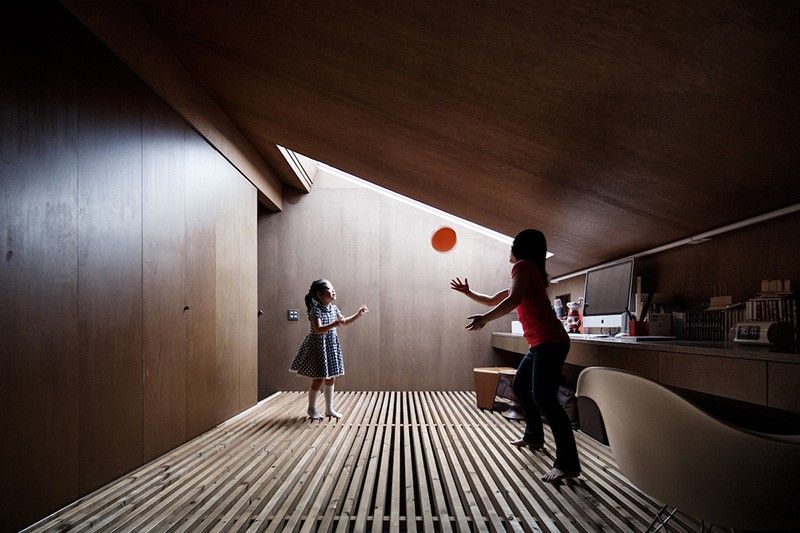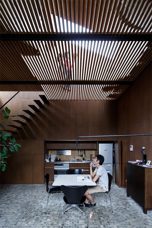 日本傳統房屋的柵欄門具有良好的採光和透風性能。如果將這種構造用於天花板和地板,隨心所欲般地構建出上下層空間,又會怎麼樣呢?建築師匠心獨運,在土地有限的東京市內建造出具有開放感的居住空間。
