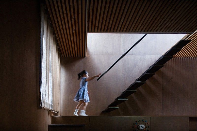 1樓的天花板,即2樓的地板,借鑒了日本傳統的「柵欄門」設計。透過柵欄木板,從天窗進來的光線能夠照射到下一樓,產生一種妙不可言的陰影效果。而且,上下空間不會被完全隔離,而是恰到好處地連成為了一體。