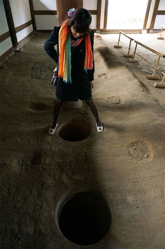 百雪隱建於室町時代前期,是日本最古老的廁所,被指定為國家的重要文化財。因此,現在當然不能使用,也禁止進入,如此珍貴的空間,我得到特別的許可入內參觀。腦海裡浮現一大群的修行僧接踵摩肩固定好位子,朝著這個圓洞用什麼樣的姿勢如廁呢。我雙腳橫跨著圓洞,充滿了無限遐想。