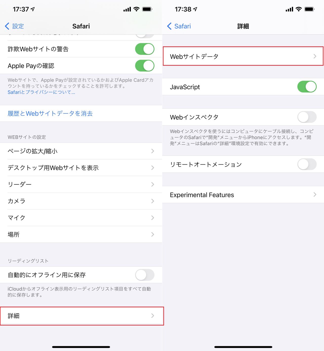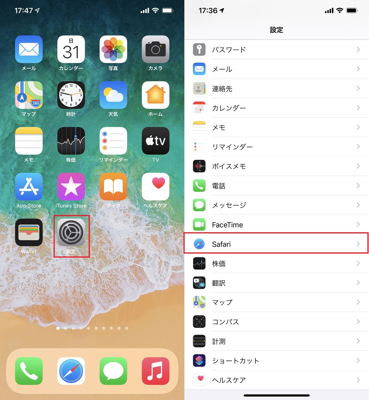 (1)iPhone、iPadの設定アプリを起動後、「Safari」→「詳