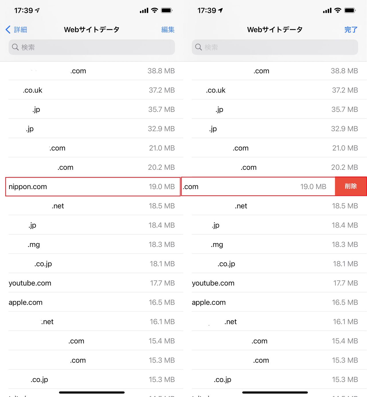(3)nippon.comのWebサイトデータを左にスワイプして「削除」を選