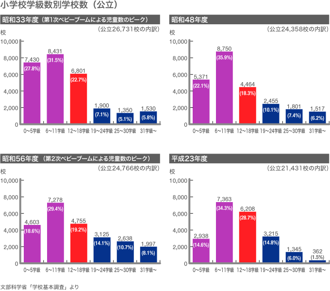 公立小学校でみてみると、こどもの数は1958年の1340万人をピークに、去年(2011年)は677万人とほぼ半減している。学校数は2万6千校あまりから2万1千校あまりへと20%減ったにすぎないが、このところそのペースが上がっている。学校規模(学級数)別に比較してみると、小規模校が減って、中規模校が増えている。数字からは、小規模校の統廃合が進み、ある程度の規模を持った学校が空き教室を抱えたまま統廃合が進んでいないと読みとれる。