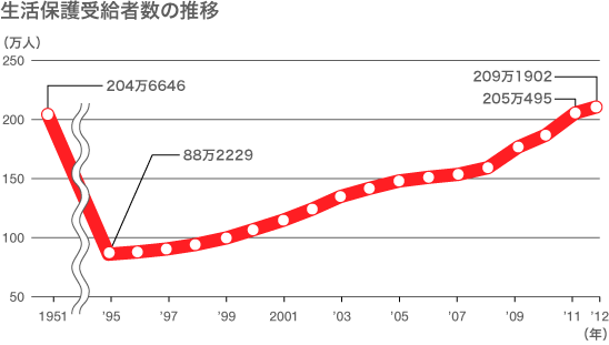 生活保護脱却を国家戦略に位置づける背景に、受給者の急増がある。過去のピークは戦後の混乱期、1951年度の月平均204万6646人だったが、その後は概ね減少し、95年は88万人に減った。それが再び増加に転じ、昨年7月には過去最多を更新、12年1月は209万1000人に達した。10年度の給付費は3兆4000億円に上る。負担割合は国が4分の3、地方が4分の1だ。