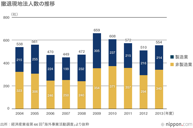 また、2013年度に進出先から撤退(解散・移転を含む)した現地法人数は554社(前年度比44社増)。このうち製造業は214社(同2社減)、非製造業は340社(同46社増)である。他方、2013年度に進出した現地法人を地域別に見ると、中国やASEAN諸国に進出した企業割合が上昇。欧州、北米に進出した企業割合が低下、NIEs3(韓国、台湾、香港)に進出した企業の割合は横ばい——という。