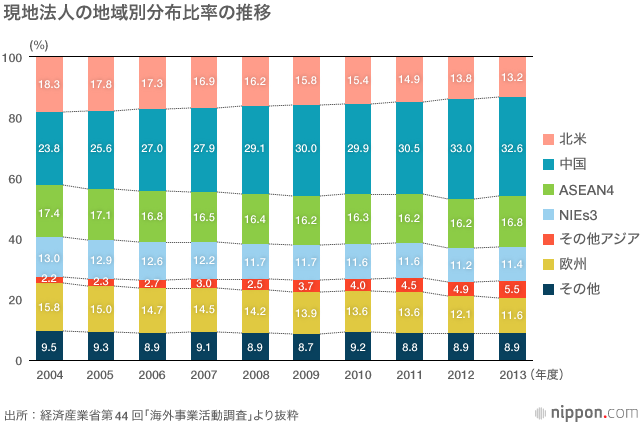 また、2013年度に進出先から撤退(解散・移転を含む)した現地法人数は554社(前年度比44社増)。このうち製造業は214社(同2社減)、非製造業は340社(同46社増)である。他方、2013年度に進出した現地法人を地域別に見ると、中国やASEAN諸国に進出した企業割合が上昇。欧州、北米に進出した企業割合が低下、NIEs3(韓国、台湾、香港)に進出した企業の割合は横ばい——という。