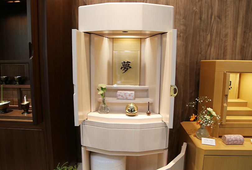 仏壇の下部に骨壺を収容できる「ご供養家具」。墓を持たない人や、墓まで出向けない人のための需要を見込んでいる