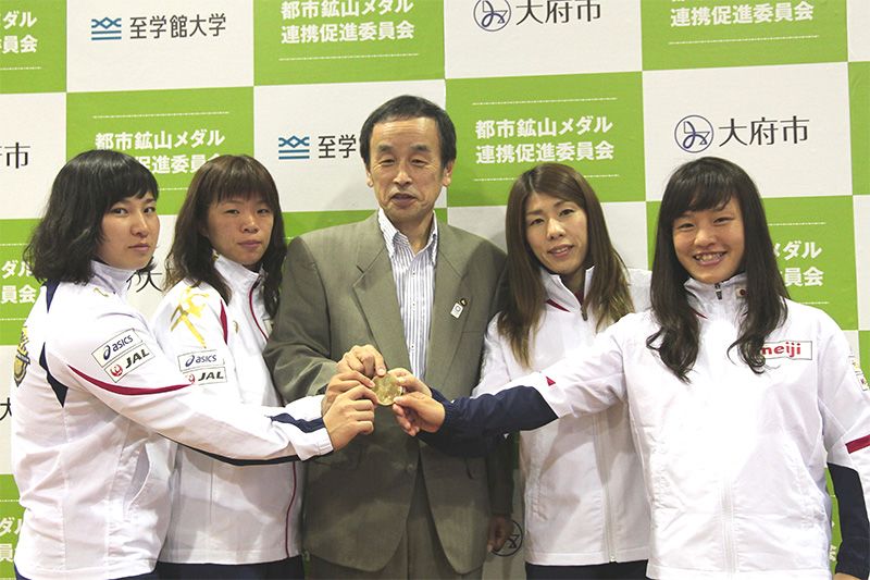 リサイクルメダルの実現を呼び掛け、記者会見した大府市の岡村秀人市長とレスリング女子の4人のメダリスト(提供・都市鉱山メダル連携促進委員会)