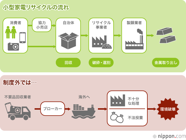 日本では2013年に「小型家電リサイクル法」が制定され、使用済みの携帯電話やパソコン、デジタルカメラ、ゲーム機などを回収・再資源化するシステムが整備された。環境省・経済産業省によると、国内で使用済みとなる小型家電は年間65万トン。すべて回収し、リサイクルに回れば28万トンの有用金属がリサイクルでき、その金額は844億円にも達する。