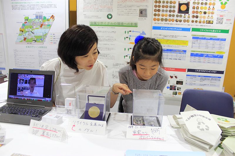 早稲田大学「環境ロドリゲス」が出展した環境イベントのブースで、リサイクル材料で作られたメダルを見る親子=2016年10月8日、東京都港区