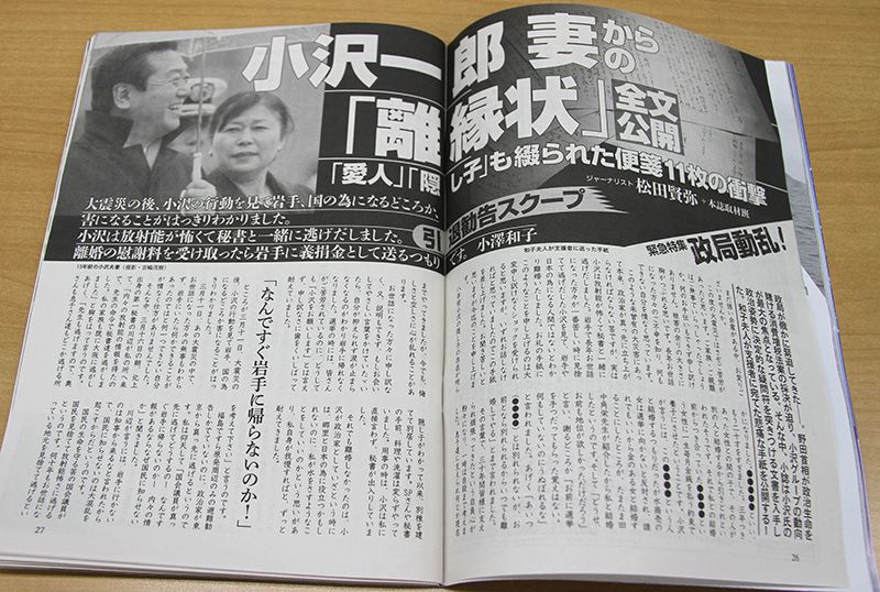 小沢一郎氏の妻から後援会関係者に送られたとされる「手紙」を掲載した『週刊文春』2012年6月21日号