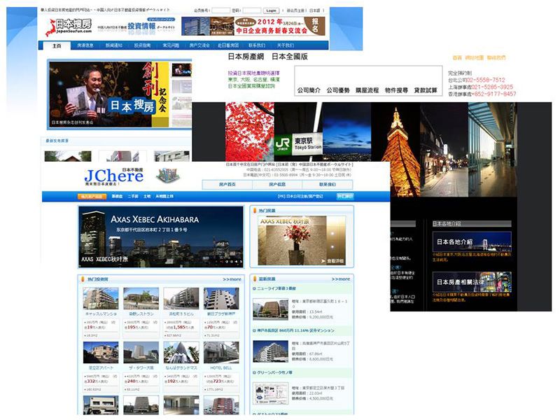 中国語の対日不動産投資サイトは「日本捜房」以外にも、台北に本部を置き、上海と香港に事務所を構える「日本房産網」や東京江東区青海に本社を置くインターネットビジネス会社ジェーシーヒア株式会社が運営する「JC here」などもあり、中国のネットに入っていくと、次々にでてくる。また、東京港区赤坂には何と、中国人向けの、中国語による不動産ホームページを制作する会社もできており、この会社は中国のネット検索大手「百度(バイドゥ)」へのサイト登録サービスも行っているという。