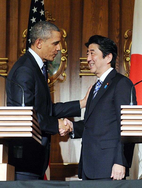 共同記者会見を終え、握手を交わす安倍晋三首相とオバマ米大統領。写真提供=時事