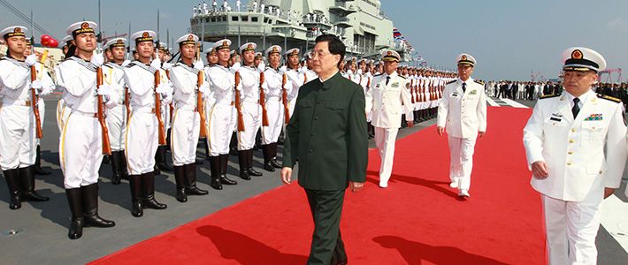 カバー写真は、2012年9月、空母「遼寧」就役式で視察する胡錦濤国家主席(当時)。(写真提供=Photo shot/時事)