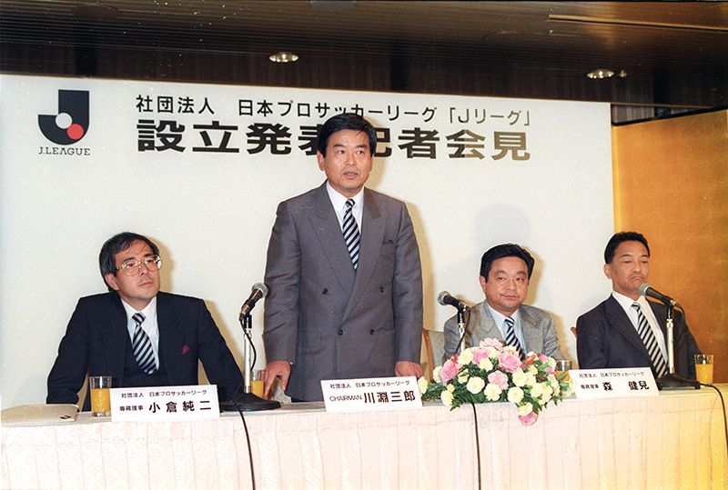 1991年11月、「Jリーグ」法人設立を発表する初代チェアマン川淵三郎氏(写真中央。写真提供=時事)