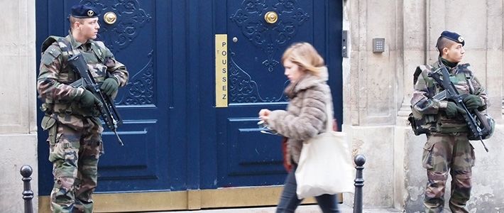 タイトル写真=連続テロ事件を受けて、ユダヤ教会を警備するフランス軍兵士。2015年2月14日、フランス・パリ(時事)