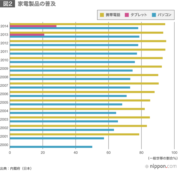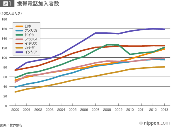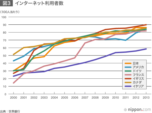 ITインフラの状況についての基本的指標を見ると、日本は少なくとも他のG7諸国並みの技術先進国となっている(図1、2、3を参照)。日本ではインターネット利用と携帯電話が急速に普及した。スマートフォンの浸透度は諸外国より低いかもしれない。推定では2014年末現在、米国の携帯電話加入者の75%がスマートフォンの利用者となっているが、一般世帯の耐久消費財購入を調べた内閣府の調査によると、日本では2015年3月現在、携帯電話を保有する一般世帯の94.4%のうち、スマートフォンの保有は60.6%にとどまっている。