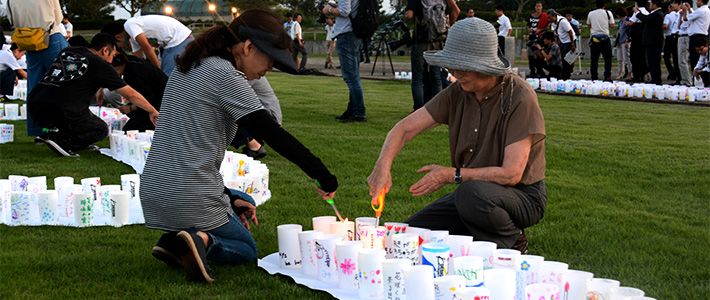バナー写真:避難指示解除を前に行われた福島県・楢葉町の復興イベントで、ろうそくに点灯する住民=2015年9月4日(時事)