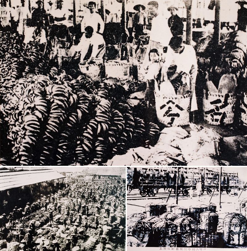 集集は台湾最大の河川、濁水溪の上流域にある美しい山あいの町だ。筆者が訪れた際に泊まった「農村老爺民宿」のオーナー・劉青松さんは郷土史家でもあり、日本統治期の写真を数多く収蔵している。学校の校庭ほどもある集荷場で、100人を優に超える編みがさをかぶった人々が、てんびん棒でバナナを運んで地面に山と積まれたバナナを点検している写真や、バナナを詰め込んだ無数の竹かごが列車に積み込まれるのを待っている写真などを見せていただいた。