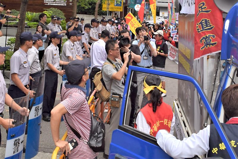 反日デモを取材中の中川さん、台湾台北、2017年7月7日(撮影:産経新聞台北支局 田中靖人)