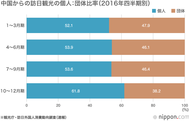 04年は当時の小泉純一郎首相が宣言した「観光立国」の翌年に当たる。03年に520万人だった訪日外国人観光客の数は、16年には2400万人を突破した。この数字の大きな変化は、われわれの取材対象にも変化をもたらした原因の一つかもしれない。かつて見るべきは「景観」だったが、今回の取材旅行では「人」となった。訪日外国人観光客数の激増以外に、近年中国からの訪日観光客は個人旅行客がそれまでの団体旅行客を上回るようになってきている(図表参照)。個人旅行客の激増により、街中で大きなスーツケースを持った中国人観光客が列に並んで公共交通機関を待つ姿や、コンビニで道を尋ねる姿を日常的に目撃するようになった。東京のオフィスビルの警備員も、ますます多くの中国人観光客が道を聞きに来るようになってきたと話しているほどである。