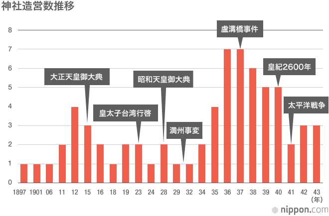 盧溝橋事件に端を発した日中戦争に続き、41年12月に日本は太平洋戦争に突入する。この頃になると既に地方財政の疲弊が現れ始め、神社敷地の買収費を含めた神社造営費はますます巨額となった。さらに神職の確保にも支障を来したため、新たな神社造営に急ブレーキがかかった。34年に北港神社が造営されて以来、終戦までの10年間に、わずか32社の神社が造営されたにすぎない。「一街庄一社」政策は掛け声に終わり、現実的な「一郡一社」程度で終わった。