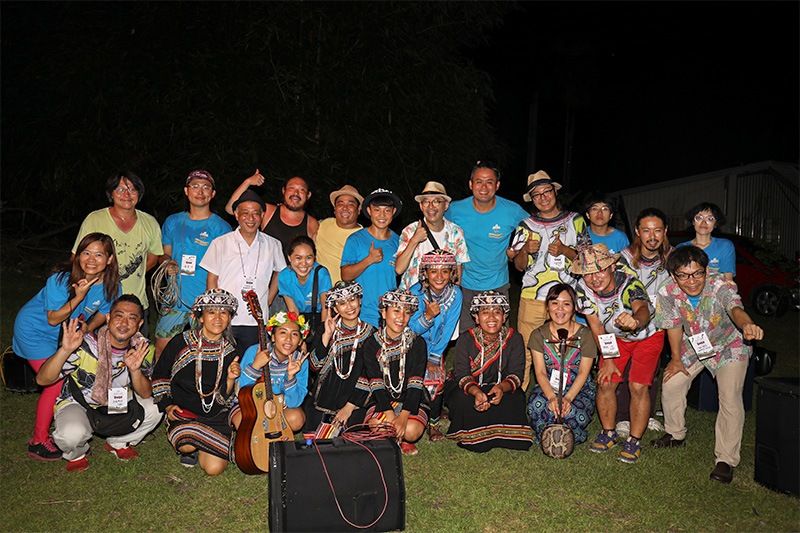 夜、小学校の校庭の一角で交流会が始まった。サビと娘たちがブヌン民族の民謡を歌い、沖縄勢が続く。名護市辺野古文化交流団として参加した古波蔵昇(三線・歌)と嘉陽宗淳(太鼓)、宜野湾市普天間を拠点に世界で活躍するオキナワンラテン音楽バンド「KACHIMBA4(カチンバ・クアトロ)」、沖縄出身で現在は東京に住む仲村奈月(三線・歌)。そこに、こはもと正(宜野湾市、サックス)、坂元健吾(浦添市、ベース)が加わる。