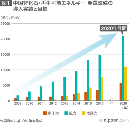 近年、中国は再生可能エネルギー普及に力を入れており、とりわけ、風力・太陽光発電設備の生産・設置量は大きな成長を遂げている。2012年から16年までの5年間、風力発電設備導入量は2.5倍、太陽光発電設備に関しては25倍にした。