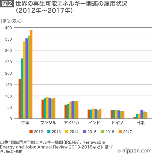 再生可能エネルギーの普及による雇用拡大も大気汚染対策の相乗効果の一つである。海外研究機関が公開した資料によれば、2017年まで、再エネ産業従事人口が最も多い国は中国であり、388万人を超えている。世界第2位であるブラジルの89万人を大きくリードしている(図2)。これに対し、日本の従事人口は26万人にとどまり、中国の15分の1に過ぎない。