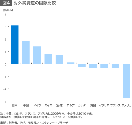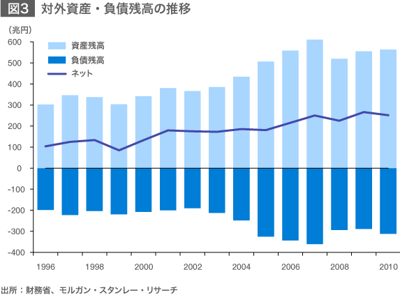 2011年の貿易収支が31年ぶりの赤字となったことで、日本の経常黒字の持続性に関する議論が活発化している。市場参加者のなかには経常黒字が早ければ向こう2~3年程度で消滅するとの意見も見受けられる。ただし、我々(モルガン・スタンレーMUFG証券)はそうした見方を取らない。時期を明示することは難しいが、世界でダントツの250兆円超の対外純資産を背景とした安定的なインカムゲイン(配当や利息などの収入)があるため、少々の貿易赤字では経常収支は赤字化しない。このため、黒字の累積とともに対外純資産がさらに積み上がるというプラスのフィードバックループが働く。