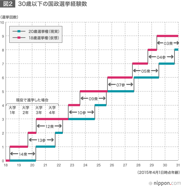 図2は、2015年4月1日時点で、各年齢の人々が選挙権を得た後に国政選挙を何回経験したのかを示している。青のラインは、選挙権を20歳に得るという現実に即したデータ、赤のラインは仮に18歳に選挙権を得た場合のデータである。下部の18、19という数字は、4月1日に誕生日を迎えた人々の年齢を示している。なお、日本の学制では、4月2日生まれから翌年4月1日生まれまでが、一つの学年を形成する。したがって、各目盛のすぐ右側から、次の右側の目盛の直上までがひとつの学年となる。留年などなく、高校卒業後すぐに大学に入学した場合の学年の範囲を図に示している。