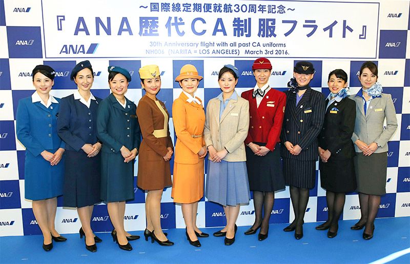 全日本空輸(全日空・ANA)の国際線就航30周年を記念し、会社設立当初から現行までの制服姿を披露する客室乗務員(2016年3月3日、千葉・成田空港/時事)