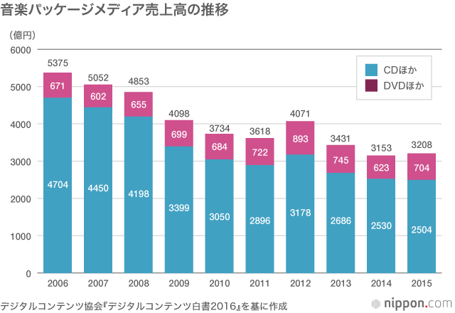 2015年の日本の音楽パッケージメディア(CD、DVDなど)市場は3208億円。下落傾向にはあるが、09年に米国を抜き、売り上げは世界一になっている。音楽産業の売り上げ全体に占める割合は7割を超え、他国よりもかなり高い。