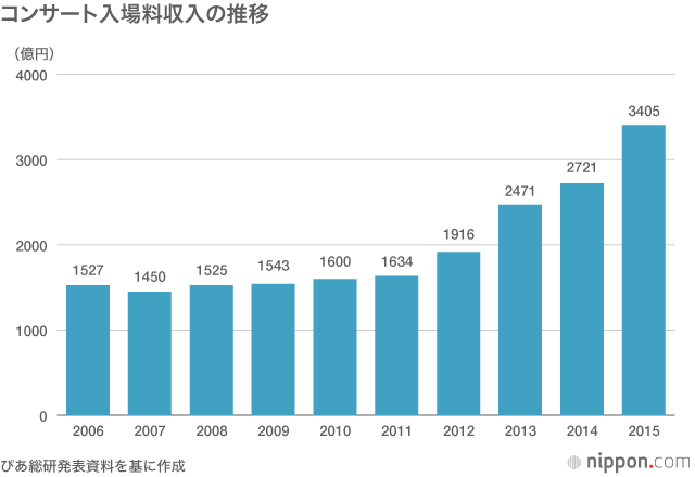 ちなみに、全体的に低迷傾向の音楽市場の中でも、コンサート市場は伸長を続け、2015年はパッケージを上回る3405億円に達した。日本人の音楽好きはこのような形でも証明されている。インバウンドが好調な流れに乗って、訪日外国人を取り込むことができれば、この市場はさらに有望であろう。