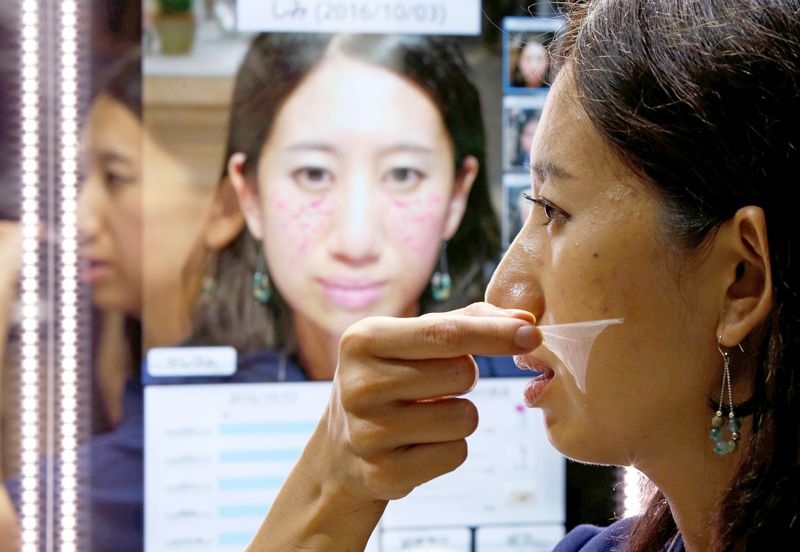 パナソニックが展示したメーキャップシート。鏡台のセンサーが人によって異なる肌の状態を分析し、専用プリンターがシミや毛穴に合わせたシートを印刷する(ロイター/アフロ)