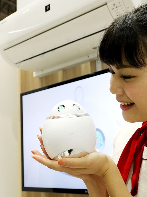 人の言葉を判断し、エアコン、テレビなどの家電を操作する、シャープのタマゴ型ロボット「ホームアシスタント」。温度と湿度のセンサーを内蔵する(時事)