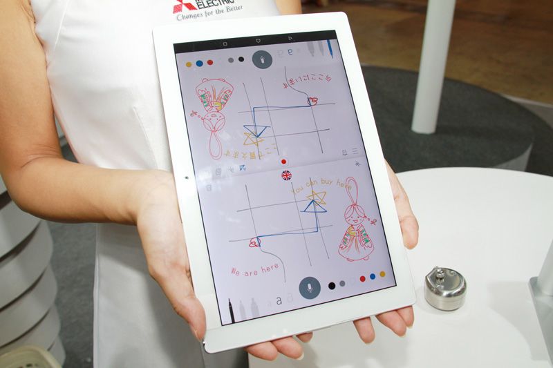 三菱電機の「しゃべり描きUI」は、話しながらタブレットやスマートフォンの画面を指でなぞると、言葉が表示される。多言語翻訳機能と組み合わせ、他の言語で表示することも可能