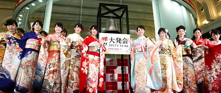 バナー写真:東京証券取引所の大発会式典後、記念撮影する晴れ着姿の市場関係者ら=2017年1月4日、東京・日本橋兜町(時事)