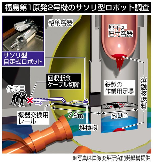 そこで関係者は、サソリ型の自走式ロボットによる調査に大きな期待を寄せていた。サソリ型ロボットとは、IRIDと東芝が開発した遠隔操作の自走式ロボットで、前部と後部にカメラがあり、線量計や温度計を搭載している。前出のX-6貫通部から投入する際には、高さ約9センチ、長さ約60センチの棒状になっているが、機器交換用レール上に降りてからは状況に応じて後部をサソリの尾のように持ち上げて撮影が可能となる。堆積物の線量や温度を実測することもでき、燃料デブリかどうかを判断できるというわけである。