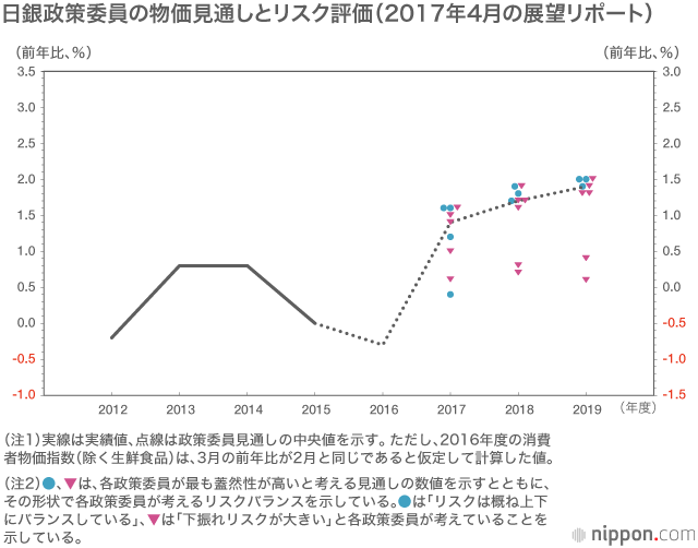 日銀は4月の「経済・物価情勢の展望」リポートで、「2%程度に達する時期は、見通し期間の中盤(2018年ごろ)になる可能性が高い。その後は、2%程度で安定的に推移していくものと見込まれる」と強気の見通しを掲げている。政策委員の見通しの中央値も18年度が+1.7%、19年度は+1.9%と高い。
