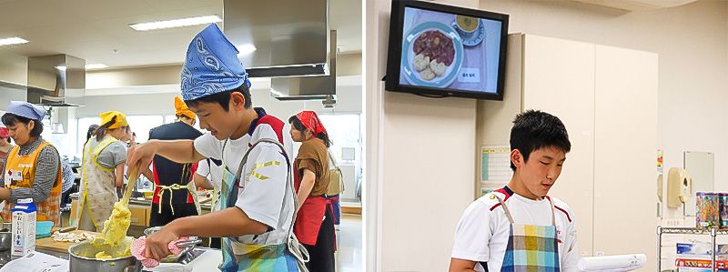 「海外の食事を作る」をテーマにした調理実習(左)と、自分が作った南アフリカのメニュー「パップ」について説明する張本智和(日本卓球協会提供)