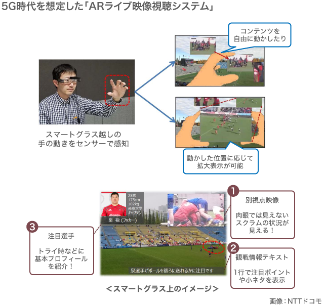 NTTドコモが5G時代を想定して開発を進める「AR(拡張現実)ライブ映像システム」。2017年12月のラグビートップリーグの試合で体験イベントが行われた