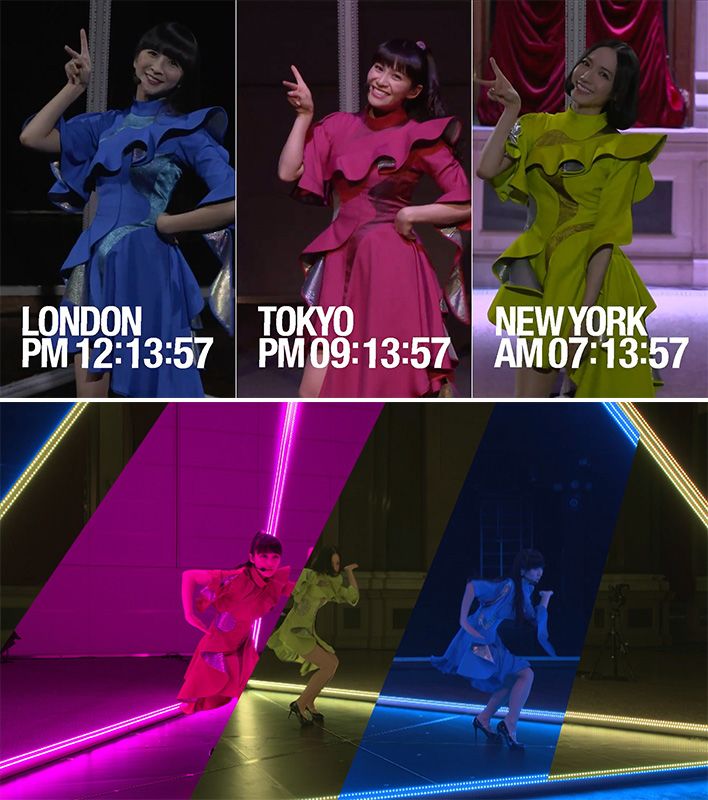 NTTドコモは17年11月、データを低遅延で伝送できる5Gなどの技術を使って、人気女性グループ「Perfume」(パフューム)の3人が東京、ロンドン、ニューヨークで別々に披露したダンスパフォーマンスの映像を同期させ、インターネットのストリーミングで全世界に向け生中継した(写真提供:NTTドコモ)