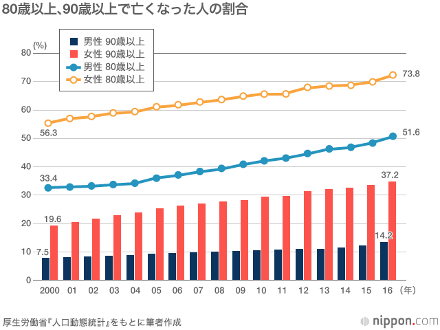 わが国では21世紀への変わり目を境に、死亡年齢の高齢化が急速に進んでいる。2000年に亡くなった男性のうち、80歳以上だった人は33.4%だったが、16年には51.6%と過半数を占めた。90歳以上で亡くなった男性は7.5%から14.2%。男性より長寿傾向にある女性を見てみると、2000年〜16年で死亡年齢80歳以上は56.3%から73.8%、90歳以上は19.6%から37.2%に増えた。