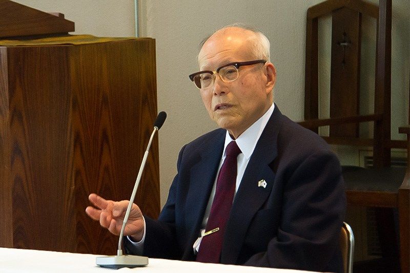 神奈川県藤沢市で開催された「ペーパー・ランタン」の上映会で被爆米兵の遺族との交流、被爆体験を語る森さん。(2018年4月)