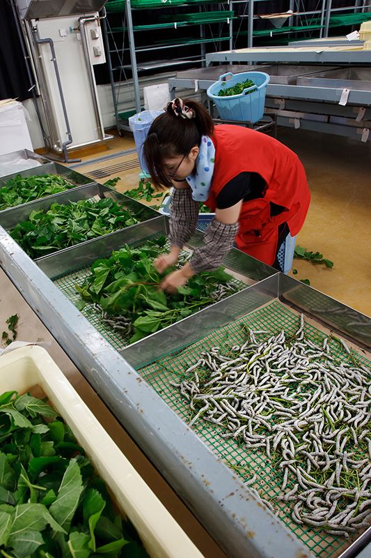 農業生物資源研究所では、さまざまな種類のカイコを飼育し研究に役立てるとともに、種の保全にも貢献している。